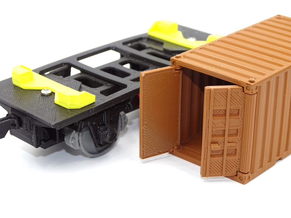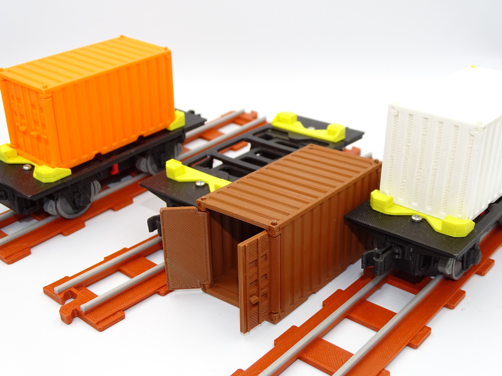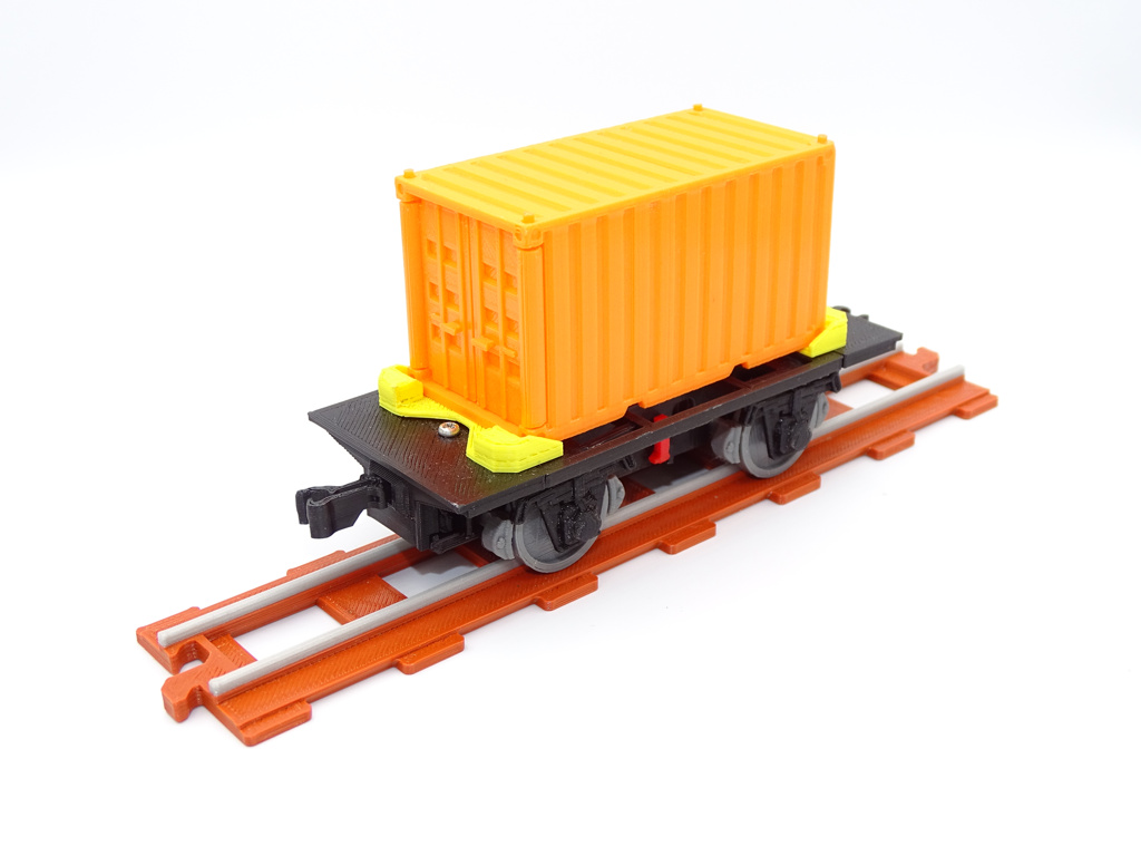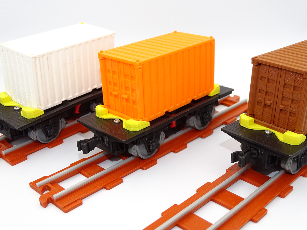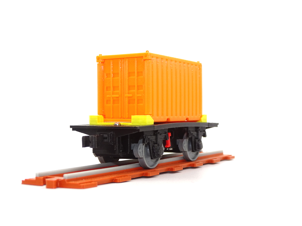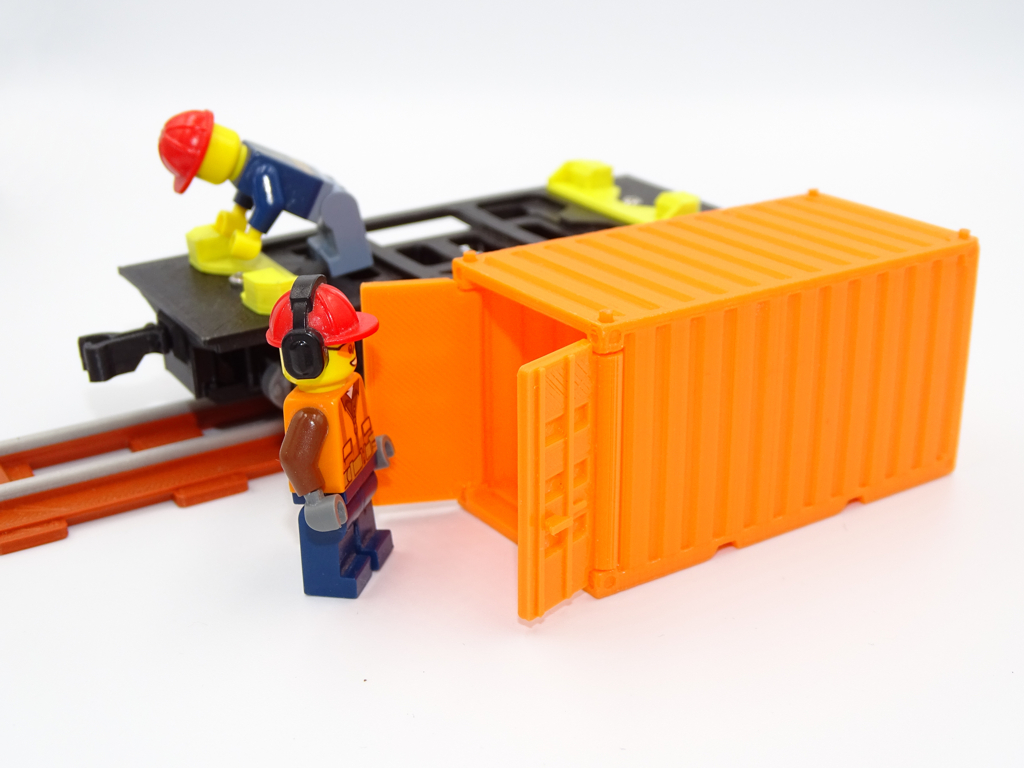 A model of container wagon. This model fits popular brick figures and fits all our ship and train models.