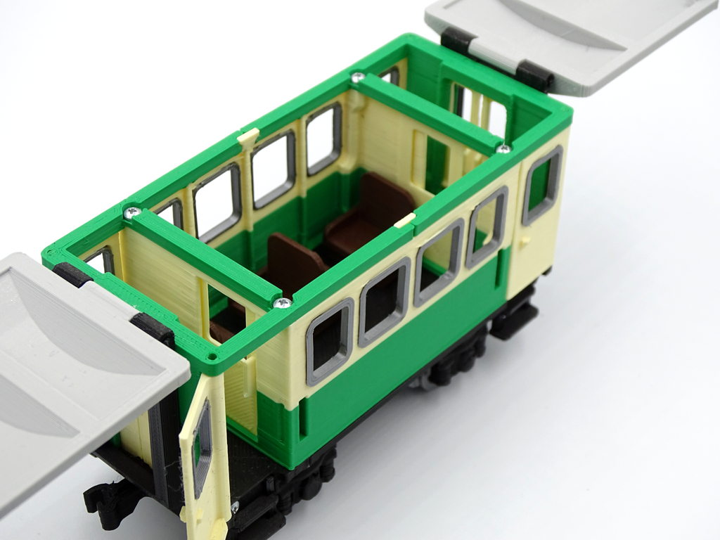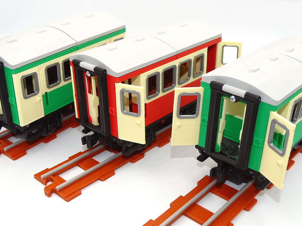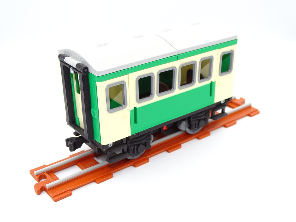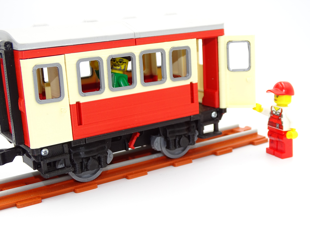 A model of passenger wagon with opening doors and roof. This model fits popular brick figures and fits all our ship and train models.