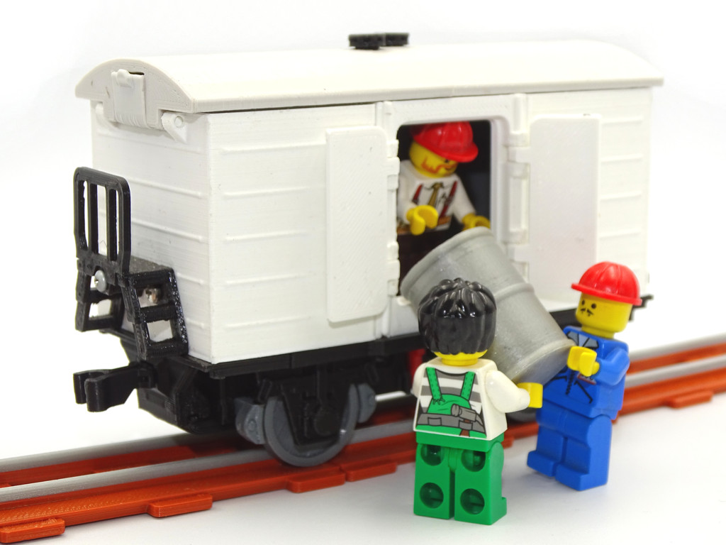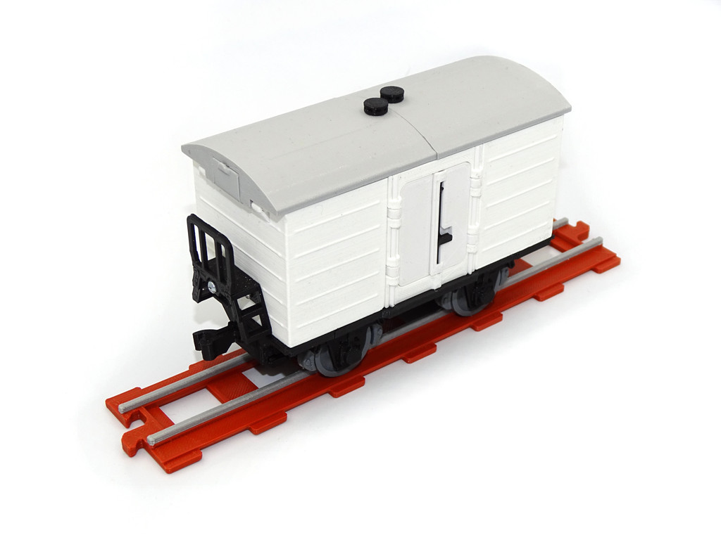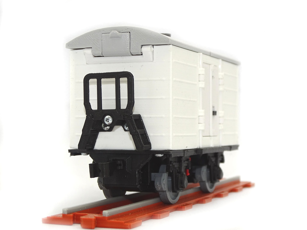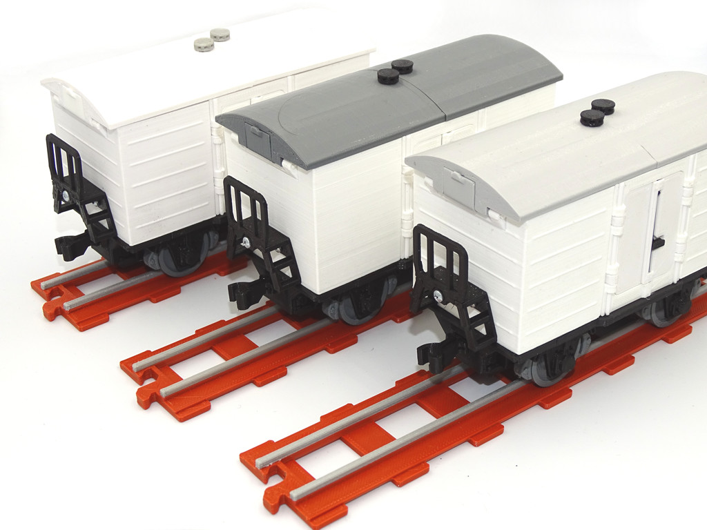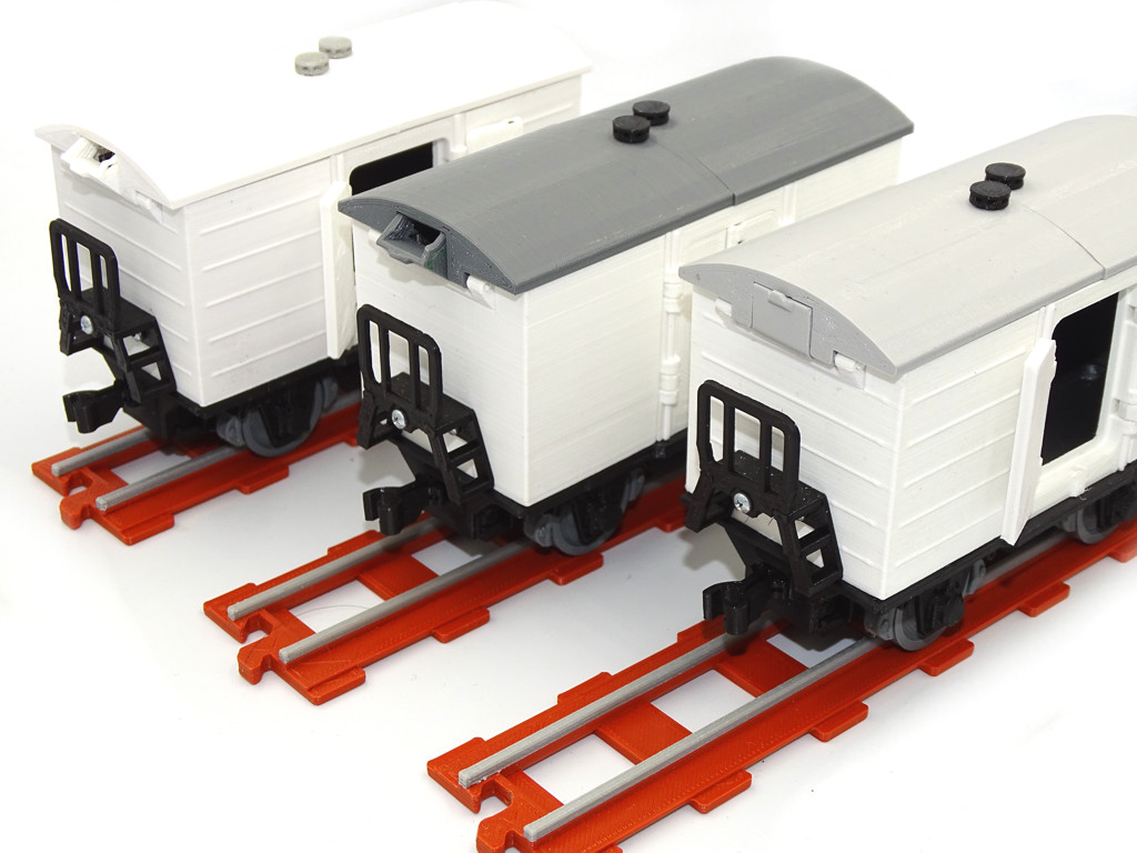 On June 26, 2022, the way couplers are mounted was changed to make trains work better on tracks. If you downloaded models before this date, you can print and install the new version of TAQ01-coupler-auto.stl and TAQ01C-coupler-cotter.stl in older wagons (included in the free locomotive model). You can also flip all couplers upside down in older wagons, but this is not recommended — trains will not take curves well on the tracks.