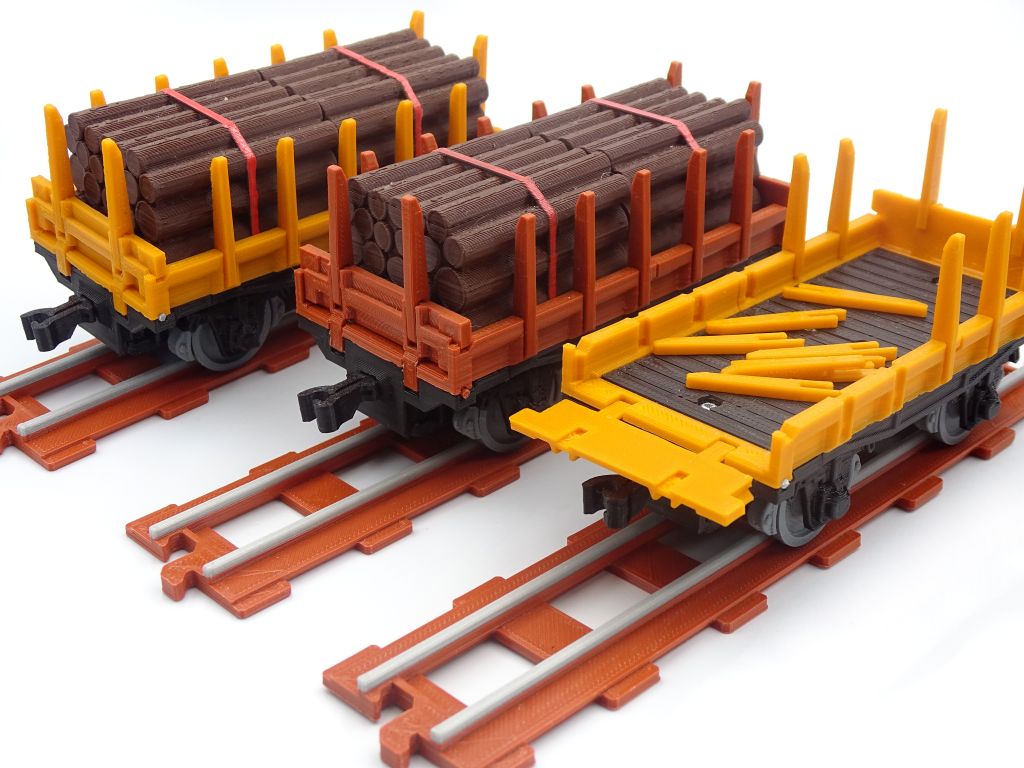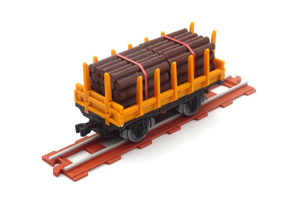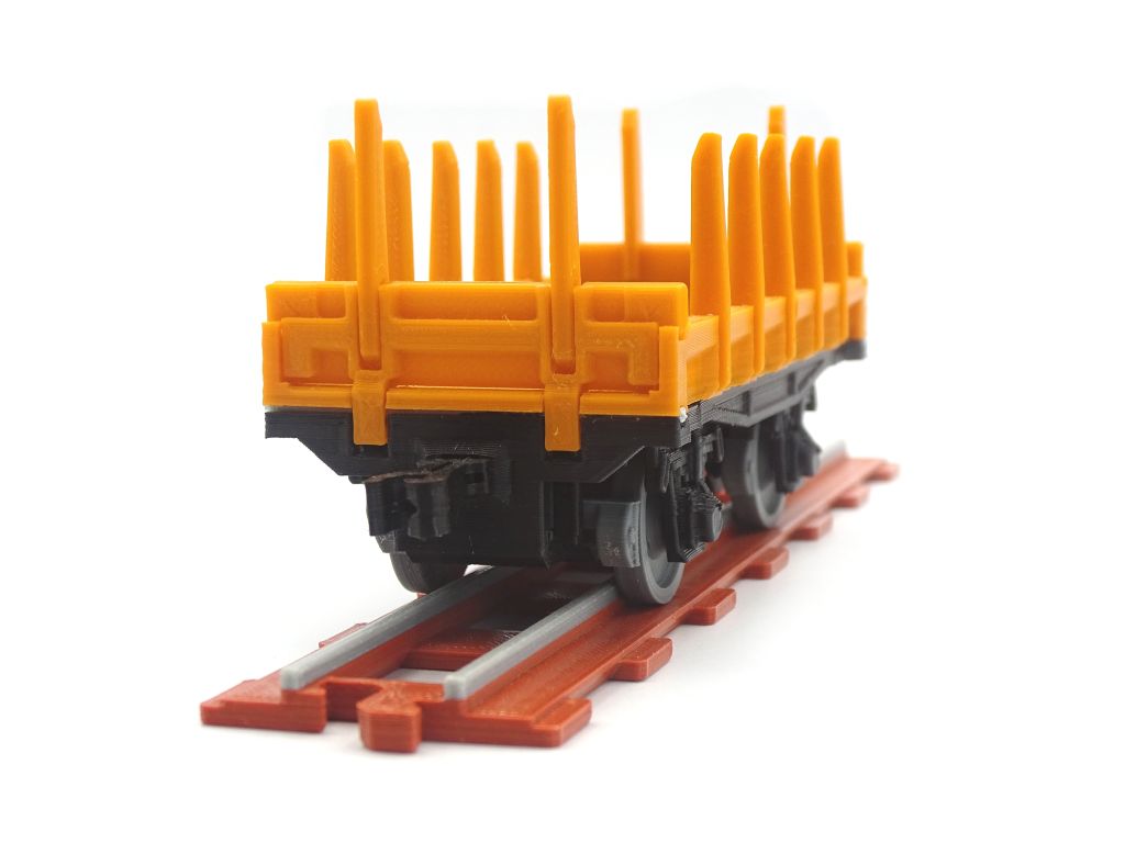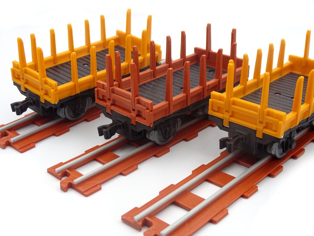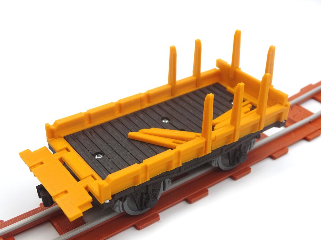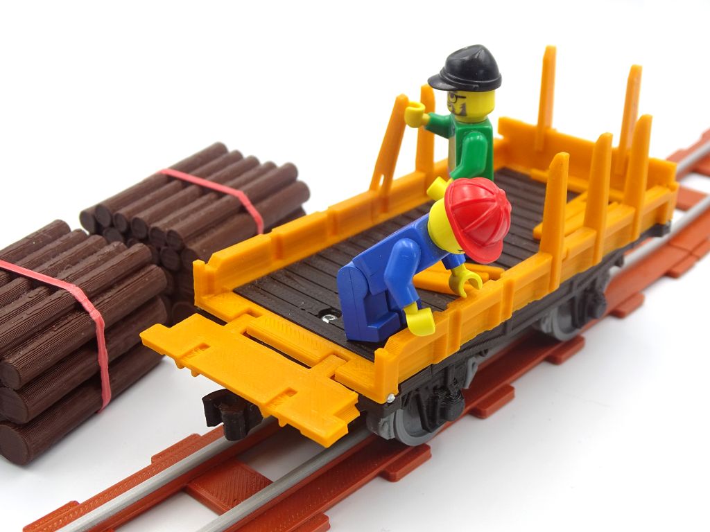 Model of a railway platform with low sides and stakes. This model fits popular brick figures and fits all our ship and train models.